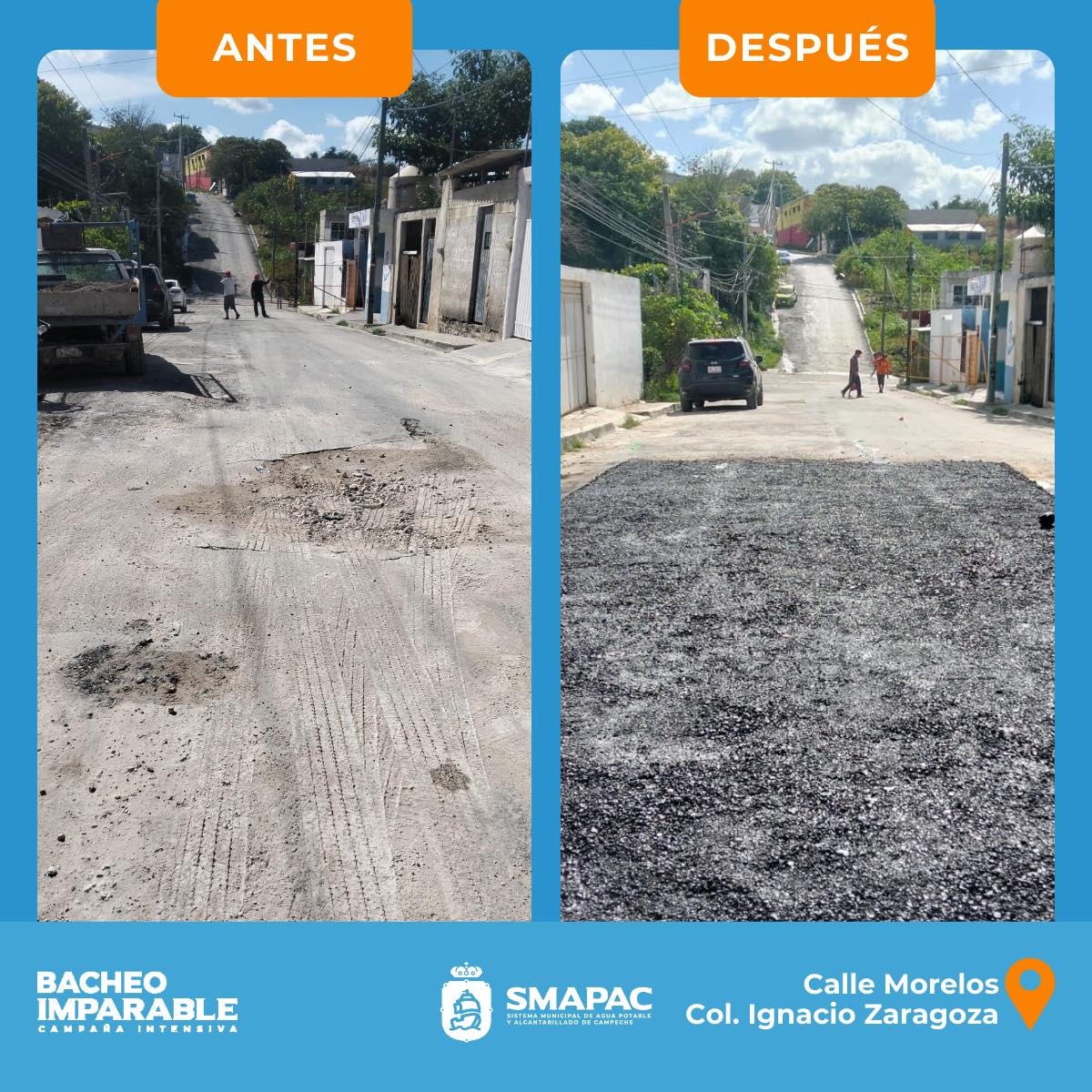 BACHEO IMPARABLE Personal del SMAPAC, realiza trabajos de bacheo por reparaciones de tubería, en la calle 108 de la colonia Bellavista📍.